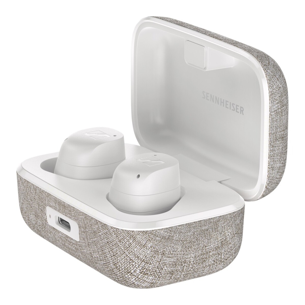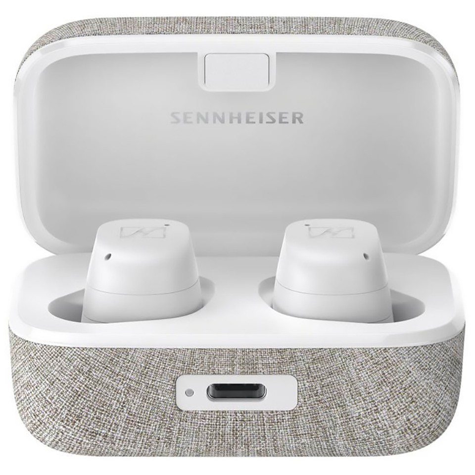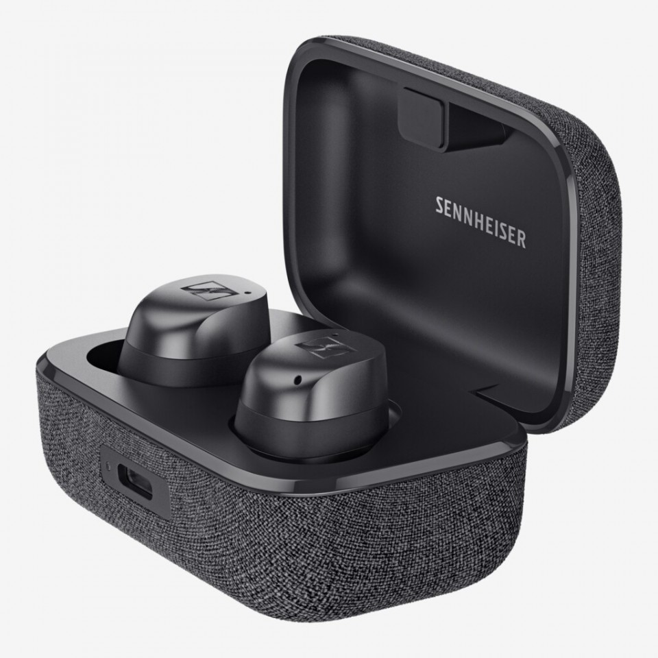 Hộp sạc của Momentum True Wireless 3 được thiết kế vuông bo tròn các góc và bọc vải bên ngoài tăng sự cao cấp và dễ cầm nắm. Cổng sạc USB Type C ở mặt trước, có 1 đèn LED báo trạng thái pin.