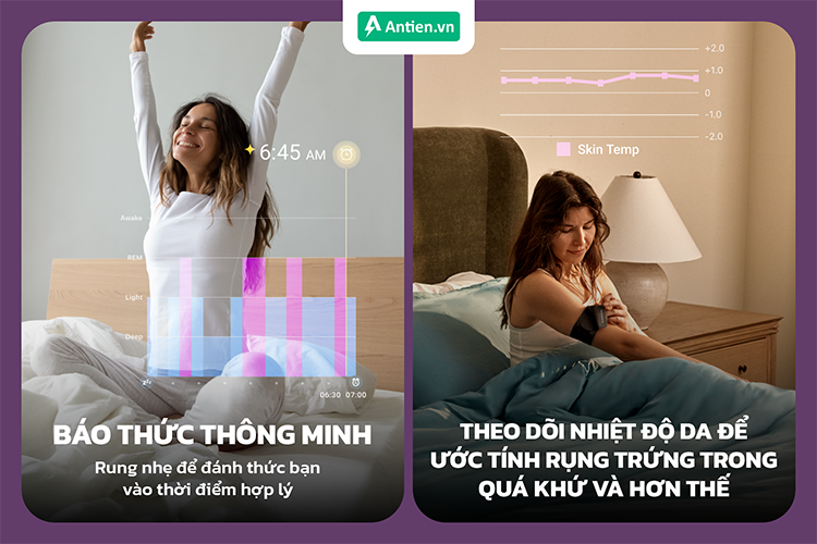 - Theo dõi sức khỏe phụ nữ: Sử dụng nhiệt độ da hiểu rõ hơn về chu kỳ kinh nguyệt, thai kỳ và ước tính thời điểm rụng trứng chính xác hơn.