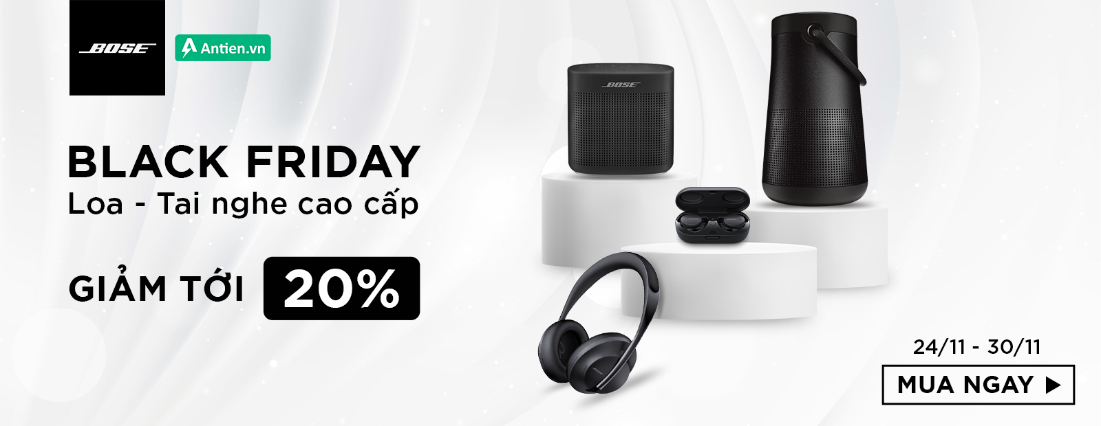 Thời tới cản không kịp, đây là cơ hội tuyệt vời để bạn sở hữu những món đồ chất lượng đến từ Bose! Vì số lượng có hạn, chương trình khuyến mại có thể kết thúc sớm hơn dự kiến.