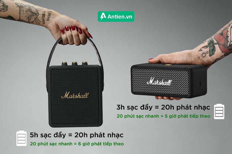 Cùng là dòng loa di động với viên pin khủng, cả Marshall Stockwell 2 và Marshall Emberton đều cho thời lượng pin lên đến 20 giờ. Tuy nhiên loa Marshall Emberton có ưu điểm hơn một chút là chỉ mất có 3 giờ để sạc đầy, trong khi Stockwell 2 phải mất 5 giờ để sạc đầy.