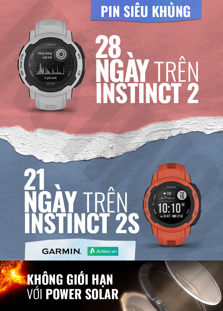 Trong một diện mạo thời trang đậm chất cá tính, phiên bản Instincr 2 Series mang đến sự hoàn hảo hơn nhờ thời lượng pin siêu khủng. Ở chế độ đồng hồ thông minh, thời lượng sử dụng pin của dòng Instinct 2 lên đến bốn tuần. Còn trên các phiên bản Solar được tích hợp sạc bằng năng lượng mặt trời có thể kéo dài đến không giới hạn ở chế độ tiết kiệm pin và được tiếp nhận năng lượng mặt trời với thời gian và cường độ phù hợp.