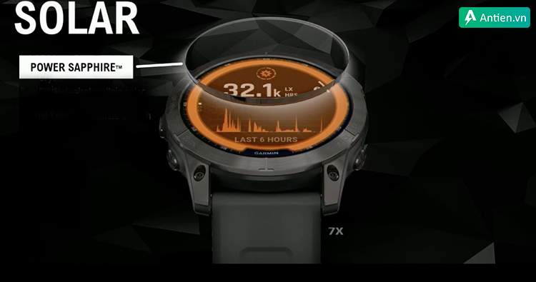 Dòng Fenix 7 của Garmin có thiết kế cao cấp nhờ vào mặt kính Power Sapphire. Màn hình Sapphire này được trang bị kèm các tấm pin mặt trời với độ bền vượt trội, có khả năng chống trầy xước để sẵn sàng cùng bạn chinh phục các hoạt động ngoài trời. Bản thân lớp kính này cũng được phủ một lớp đặc biệt để hấp thụ ánh sáng mặt trời và chuyển thành năng lượng pin.