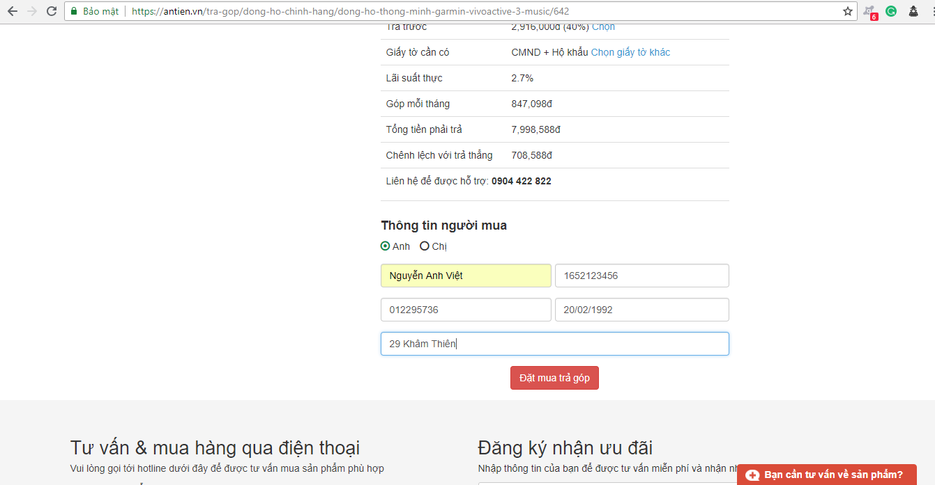 B5: Nhập chính xác thông tin của bạn vào các ô yêu cầu. Sau đó nhấn "Đặt mua trả góp" để hoàn tất việc đăng ký mua hàng trả góp.