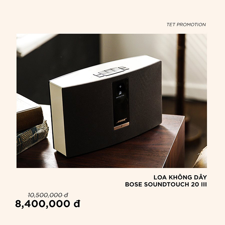 Từ ngày 10/01 tới ngày 22/01/2020 An Tiến mở ưu đãi tới 20% với các thiết bị âm thanh của Bose. Trong đợt ưu đãi này Loa không dây Bose Soundtouch 20 III từ 10.500.000đ chỉ còn 8.400.000đ, Loa Bose Home Speaker 500 từ 10.990.000đ nay chỉ còn 9.342.000đ và còn rất nhiều các ưu đãi tuyệt vời khác