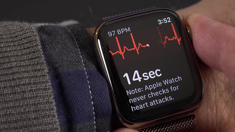 Ngược lại ở trên thiết bị đeo Apple Watch Series 6 lại được trang bị tính năng ECG (còn gọi là điện tâm đồ) ghi lại các biến thiên của dòng điện do tim phát ra trong khi hoạt động co bóp, phát hiện ra những điểm bất thường của tim như: loạn nhịp tim, nhồi máu cơ tim, lớn tim (to tim).