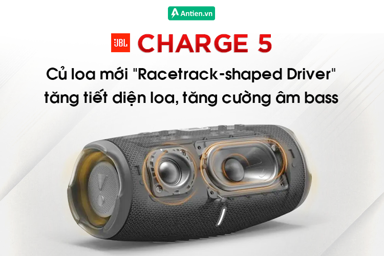 Để mang đến trải nghiệm âm nhạc tuyệt vời nhất cho người nghe, JBL Charge 5 được trang bị driver dạng racetrack gồm loa tweeter riêng biệt và 2 loa bass thụ động. Củ bass thụ động cho âm trầm mạnh mẽ đủ sức khuấy động mọi không gian.